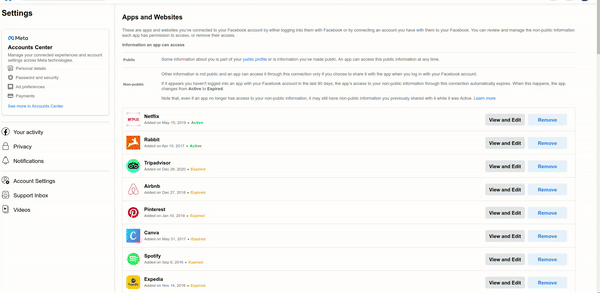 Before you delete some of these websites or apps, I recommend going to each service and deleting the account first on the main service, changing the credentials to an actual email and password, and then removing the access on the Facebook panel.